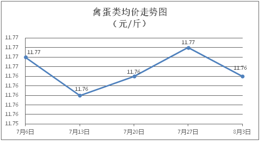 禽蛋类商品价格小幅波动。所监测的5种禽蛋类商品价格波动情况为2涨1跌2平,综合零售均价为每斤11.76元,环比下降0.05%。其中:白条鸡、白条鸭零售均价分别为每斤20.66元、15.42元,环比分别下降0.24%、上涨0.06%;鸡蛋、鸭蛋零售均价分别为每斤6.53元、7.07元,环比分别上涨0.15%、持平。