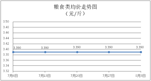 粮食类商品价格保持稳定。所监测的4种粮食类商品价格均持平,综合零售均价为每斤3.390元。其中:珍珠米、面粉零售均价分别为每斤3.10元、3.40元,环比均持平。