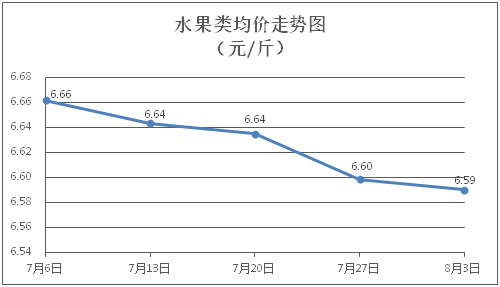 水果类商品价格持续走弱。所监测的6种水果商品价格波动情况为1涨3跌2平,综合零售均价为每斤6.59元,环比下降0.13%。其中橙子、香蕉、葡萄零售均价分别为每斤6.68元、3.34元、13.60元,环比分别上涨2.14%、下降0.89%、下降1.09%。