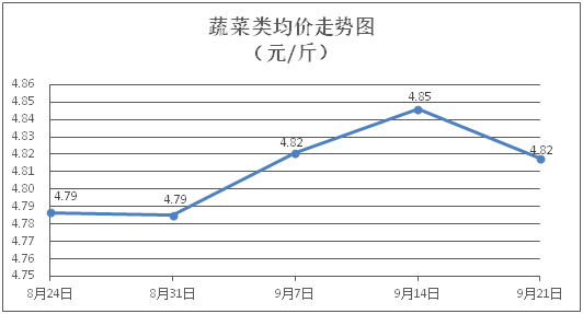 蔬菜类商品价格升降互现。所监测的32 种蔬菜商品价格波动情况为11涨18跌3平,综合零售均价为每斤4.82元,环比下降0.59%。其中:涨幅居前的品种包括丝瓜、莴笋、白苋菜,零售均价分别为每斤5.71元、4.35元、4.49元,环比分别上涨6.73%、4.32%、2.51%;跌幅靠前的品种包括本地菜心、水空心菜、青皮冬瓜,零售均价分别为每斤5.20元、4.03元、2.53元,环比分别下降6.31%、5.84%、4.17%。