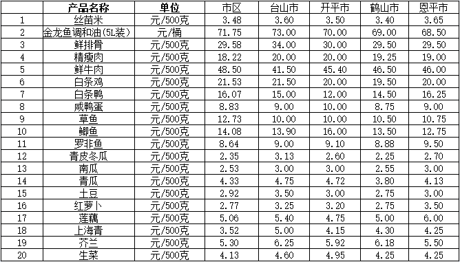 说明:1、表中价格为该地区监测点上周综合平均价;2、“市区”含蓬江区、江海区、新会区,价格分别采自蓬江市场、江南市场、城东市场等13家农贸市场;3、其他四个县市价格分别采自新华市场、锦江市场等8家农贸市场。