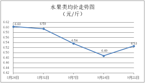 水果类商品价格有所回升。所监测的6种水果商品价格波动情况为4涨2跌,综合零售均价为每斤6.53元,环比上涨0.59%。其中橙子、香蕉、梨零售均价分别为每斤7.38元、3.01元、5.31元,环比分别上涨3.22%、下降1.31%、上涨1.53%。