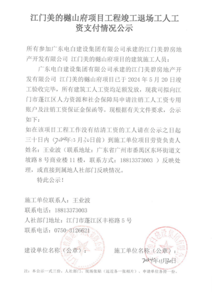 现将樾山府14幢(垃圾转运站)工程项目《工程竣工退场工人工资支付情况公示》挂网公示如下,如发现该项目存在欠薪等相关情况的,请在30日内,请携带相关佐证材料,到施工单位项目或者人社部门反映情况。