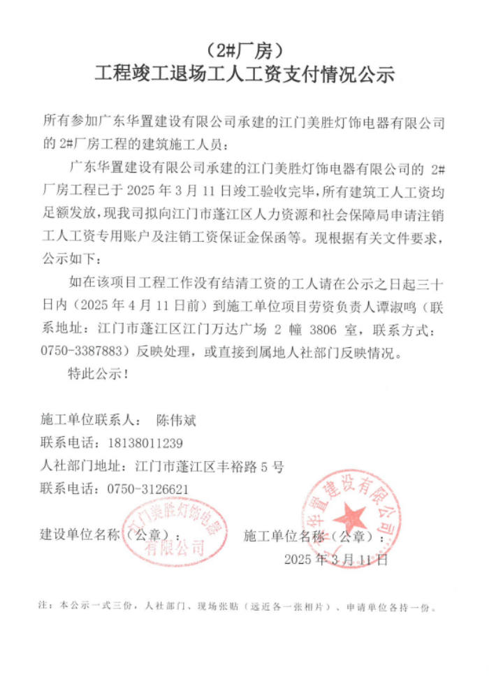 现将江门美胜灯饰电器有限公司2#厂房工程项目《工程竣工退场工人工资支付情况公示》挂网公示如下,如发现该项目存在欠薪等相关情况的,请在30日内,请携带相关佐证材料,到施工单位项目或者人社部门反映情况。