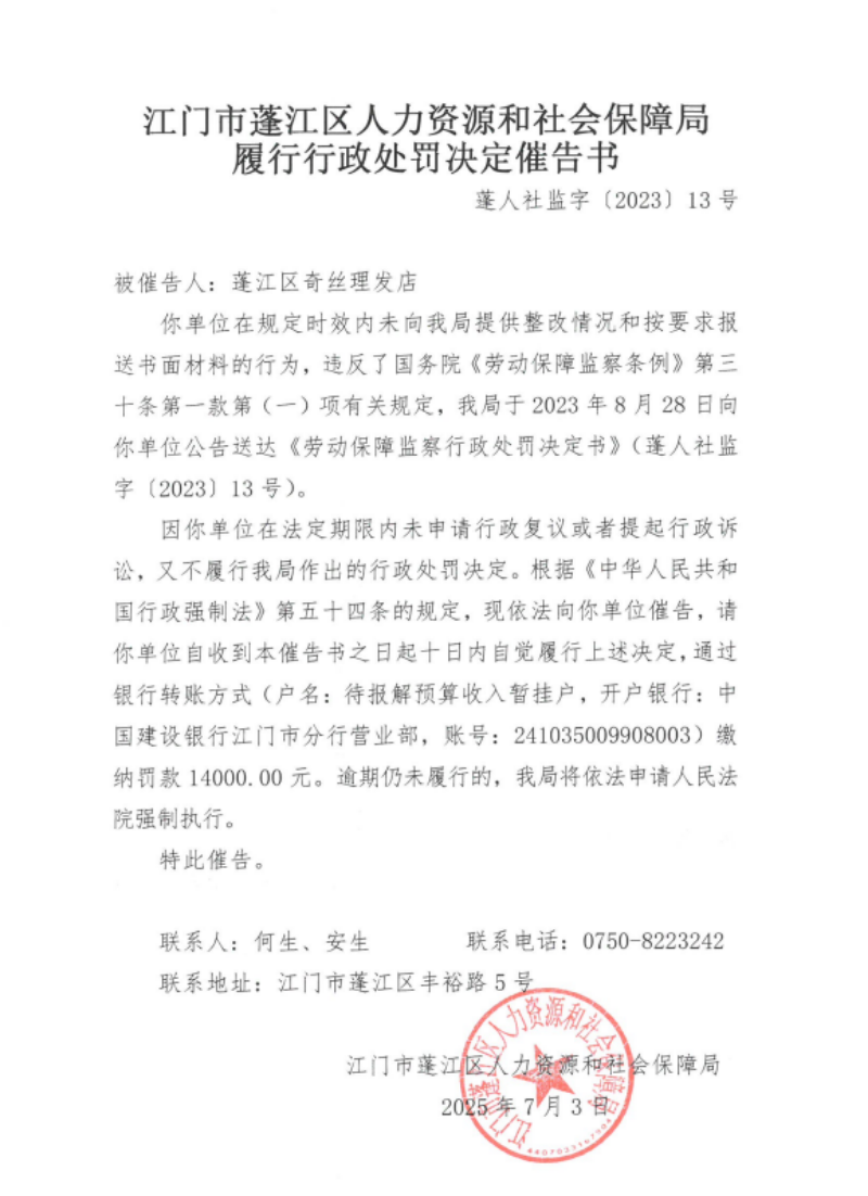 履行行政处罚决定催告书公告送达(蓬江区奇丝理发店)
