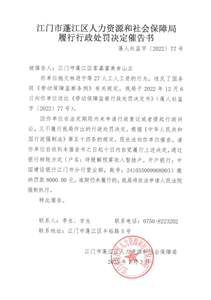 履行行政处罚决定催告书公告送达(江门市蓬江区客嘉富美食山庄)
