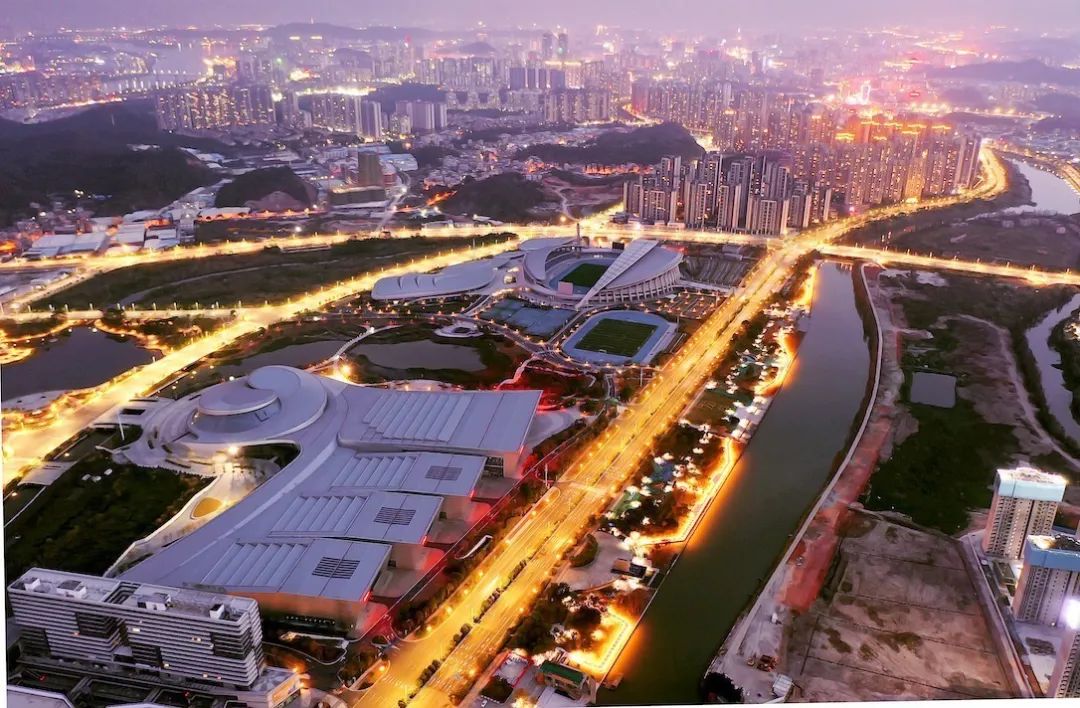 夜幕下的珠西国际会展中心和江门体育中心分外迷人。江门日报记者/周华东 摄
