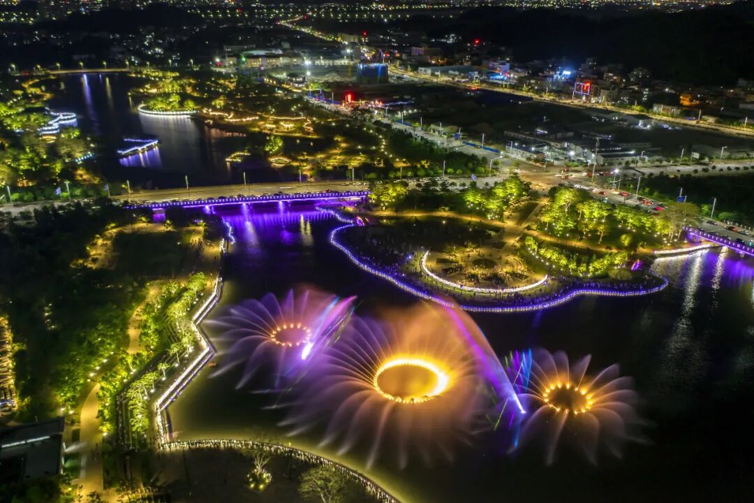 天沙河景观示范段工程位于龙舟山森林公园,江门体育中心对面,总占地面积约3.9万平方米,结合现有生态基地基础,设置观龙栈桥、生态湿地公园、儿童游乐园、科技运动园及亮化景观带等观赏、游乐区域。其中,科技运动园依托4.0版城市公园的发展模式,设置了喷泉互动单车、诗歌聚场、电竞足球等多样化、智能化游乐项目。