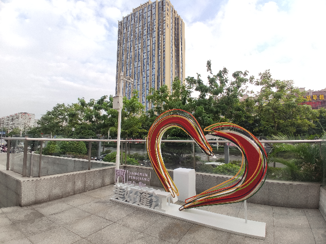 该装置位于汇悦大融城广场,由6条彩色心型线条汇聚而成,寓意蓬江6个镇(街)缤纷多彩的文旅资源,同时也传达出年轻人爱生活、爱自由的活力。