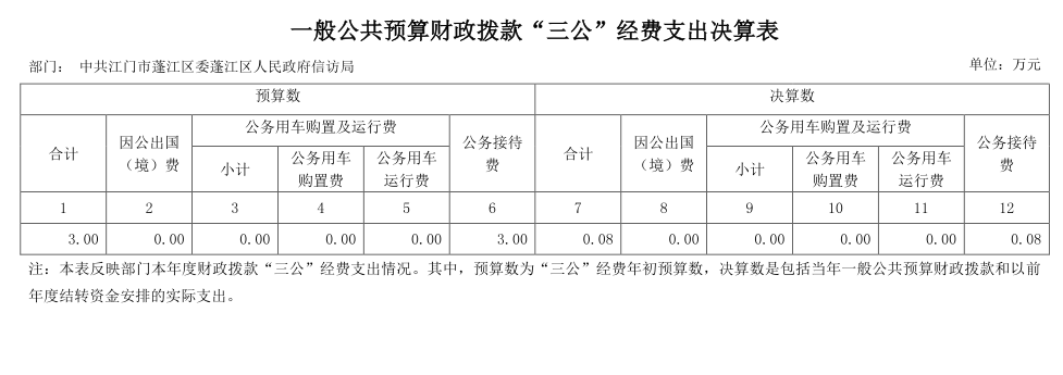 中共江门市蓬江区委蓬江区人民政府信访局2018 年度“三公”经费财政拨款支出决算为 0.08 万元,完成预算 3.00 万元的 2.53% 。其中:因公出国(境)费支出决算为 0.00 万元,完成预算 0.00 万元的 0% ;公务用车购置及运行费支出决算为 0.00 万元,完成预算 0.00 万元的 0% ;公务接待费支出决算为 0.08 万元,完成预算 3.00 万元的 2.53% 。