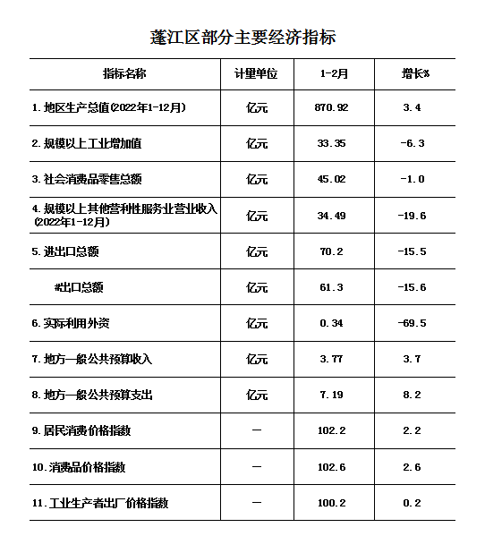 1-2月,蓬江区全面贯彻落实中央经济工作会议、省委及市委经济工作会议的部署要求,统筹推进经济社会高质量发展,经济指标运行走势稳中加固、稳中向好。