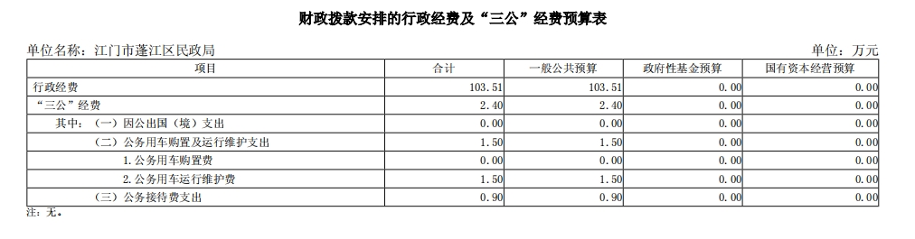 2025年本部门财政拨款安排“三公”经费2.4万元,比上年减少0.2万元,下降7.7%,主要原因是厉行节约,压减经费开支。其中:因公出国(境)费0万元,比上年增加0万元,增长0%,主要原因是与上年持平,无增减变化;公务用车购置及运行维护费1.5万元(公务用车购置费0万元,比上年增加0万元;公务用车运行维护费1.5万元,比上年减少0.2万元。)比上年减少0.2万元,下降11.8%,主要原因是厉行节约,压减经费开支;公务接待费0.9万元,比上年增加0万元,增长0%,主要原因是上年持平,无增减变化。