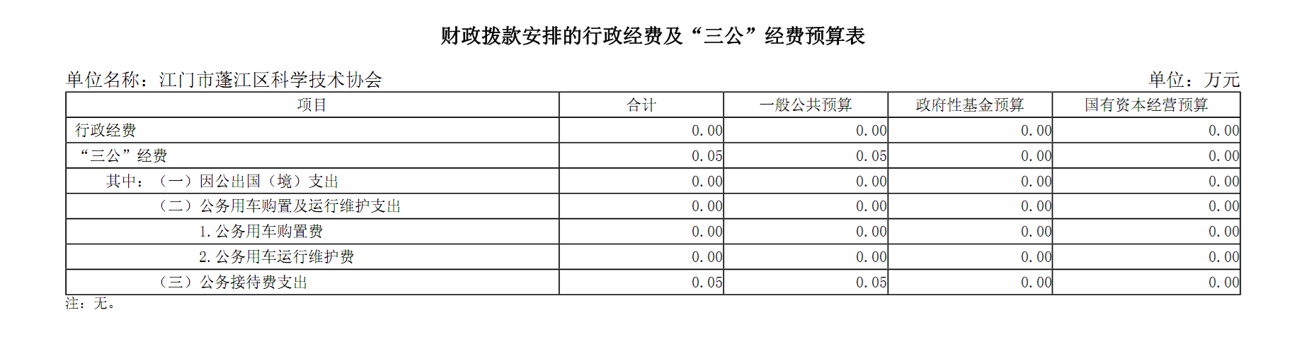 2025年本部门财政拨款安排“三公”经费0.05万元,比上年增加0万元,增长0%,主要原因是与上年持平,无增减变化。其中:因公出国(境)费0万元,比上年增加0万元,增长0%,主要原因是与上年持平,无增减变化;公务用车购置及运行维护费0万元(公务用车购置费0万元,比上年增加0万元;公务用车运行维护费0万元,比上年增加0万元。)比上年增加0万元,增长0%,主要原因是与上年持平,无增减变化;公务接待费0.05万元,比上年增加0万元,增长0%,主要原因是与上年持平,无增减变化。