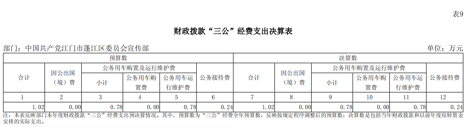 中国共产党江门市蓬江区委员会宣传部2024年度“三公”经费财政拨款支出决算为1.02万元,完成全年预算1.02万元的100%,比上年决算数减少0.12万元,下降10.3%。其中:因公出国(境)费支出决算为0万元,完成预算0万元的--%(基数为0,不可比),比上年决算数增加0万元,增长--(基数为0,不可比);公务用车购置及运行维护费支出决算为0.78万元,完成预算0.78万元的100%,比上年决算数增加0.37万元,增长89.2%;其中:公务用车购置支出决算为0万元,完成预算0万元的--%(基数为0,不可比),比上年决算数增加0万元,增长--(基数为0,不可比);公务用车运行维护费支出决算为0.78万元,完成预算0.78万元的100%,比上年决算数增加0.37万元,增长89.2%;公务接待费支出决算为0.24万元,完成预算0.24万元的100%,比上年决算数减少0.48万元,下降66.7%。